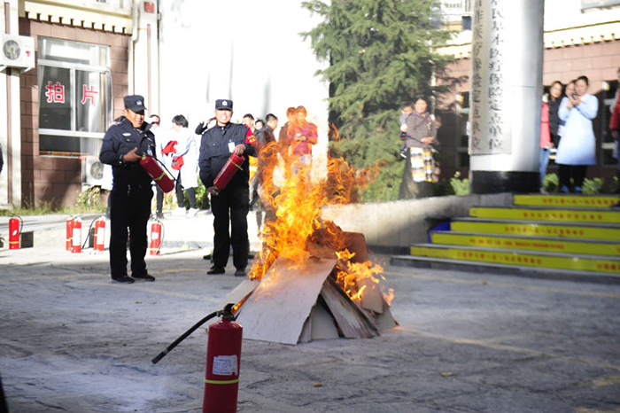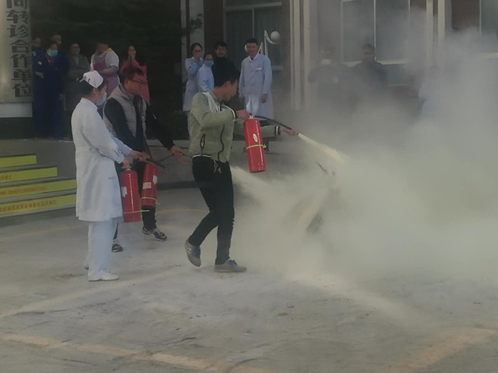 第二部分在我院住院區(qū)大院內,消防隊員進行了現(xiàn)場演示,講解了如何使用滅火器,并現(xiàn)場點燃了一堆火,使用滅火器將大火撲滅,以直觀的方式,告訴醫(yī)護人員如何使用滅火器材;我院員工也派出后勤、臨床代表參加了演練。