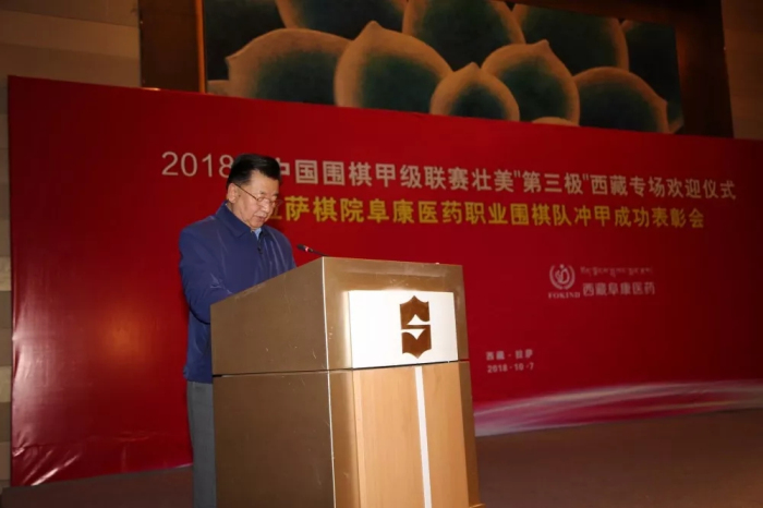 西藏自治區(qū)政府副主席甲熱·洛桑旦增代表自治區(qū)人民政府對各位嘉賓的到來表示熱烈歡迎。他說圍棋是一切棋類運(yùn)動的鼻祖,是中華民族優(yōu)秀傳統(tǒng)文化的瑰寶,融合了軍事、哲學(xué)、詩詞等多種文藝形式,是中華民族幾千年來智慧的結(jié)晶,也是對人類文明的重要貢獻(xiàn)。在建設(shè)社會主義文化強(qiáng)國、體育強(qiáng)國、實(shí)現(xiàn)中華民族偉大復(fù)興的中國夢進(jìn)程中,圍棋這樣一項(xiàng)由文化融進(jìn)體育的智慧運(yùn)動承擔(dān)著重要的歷史使命。拉薩棋院西藏阜康醫(yī)藥職業(yè)圍棋隊(duì)沖甲成功是西藏體育發(fā)展的重大突破,也是社會力量推動體育事業(yè)發(fā)展的典范。為此我代表自治區(qū)人民政府對西藏阜康醫(yī)藥職業(yè)圍棋隊(duì)沖甲成功表示熱烈祝賀,對社會各界支持西藏體育事業(yè)發(fā)展表示感謝,自治區(qū)政府將加快推進(jìn)體育事業(yè)改革、做強(qiáng)做大體育產(chǎn)業(yè),促進(jìn)全區(qū)體育事業(yè)再上臺階。祝愿2018年中國圍棋甲級聯(lián)賽壯美“第三極”西藏專場取得成功,祝愿西藏阜康醫(yī)藥職業(yè)圍棋隊(duì)在明年的甲級聯(lián)賽中取得更好成績。