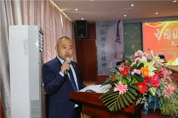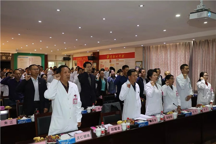 慶祝活動(dòng)在下午15點(diǎn)準(zhǔn)時(shí)進(jìn)行。西藏阜康醫(yī)院醫(yī)務(wù)科主任田鵬帶領(lǐng)與會(huì)醫(yī)師代表宣讀“希波克拉底誓言”,西藏阜康醫(yī)院婦產(chǎn)兒童院區(qū)(院區(qū)三)劉連福院長致辭。